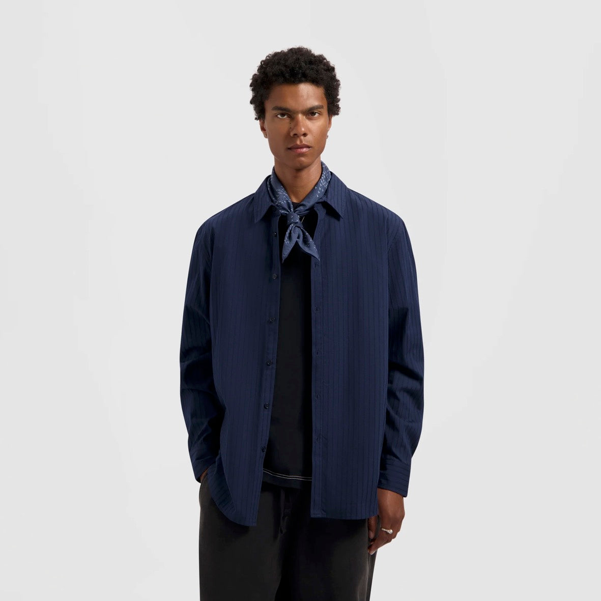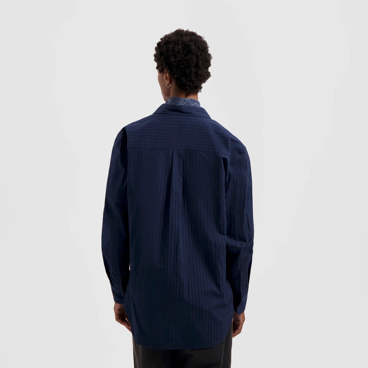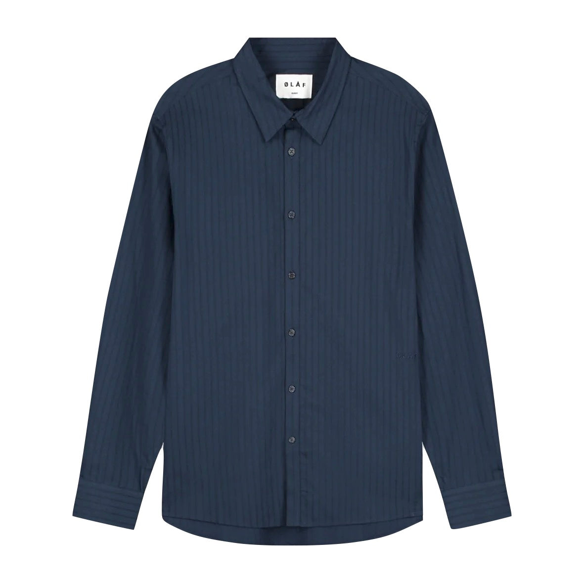 The Stitched Striped Relaxed Shirt in Navy is defined by its subtle stitched stripe texture. Designed from 100% cotton for a breathable finish, it offers a relaxed fit and ØLÅF logo embroidery — perfect for everyday wear.