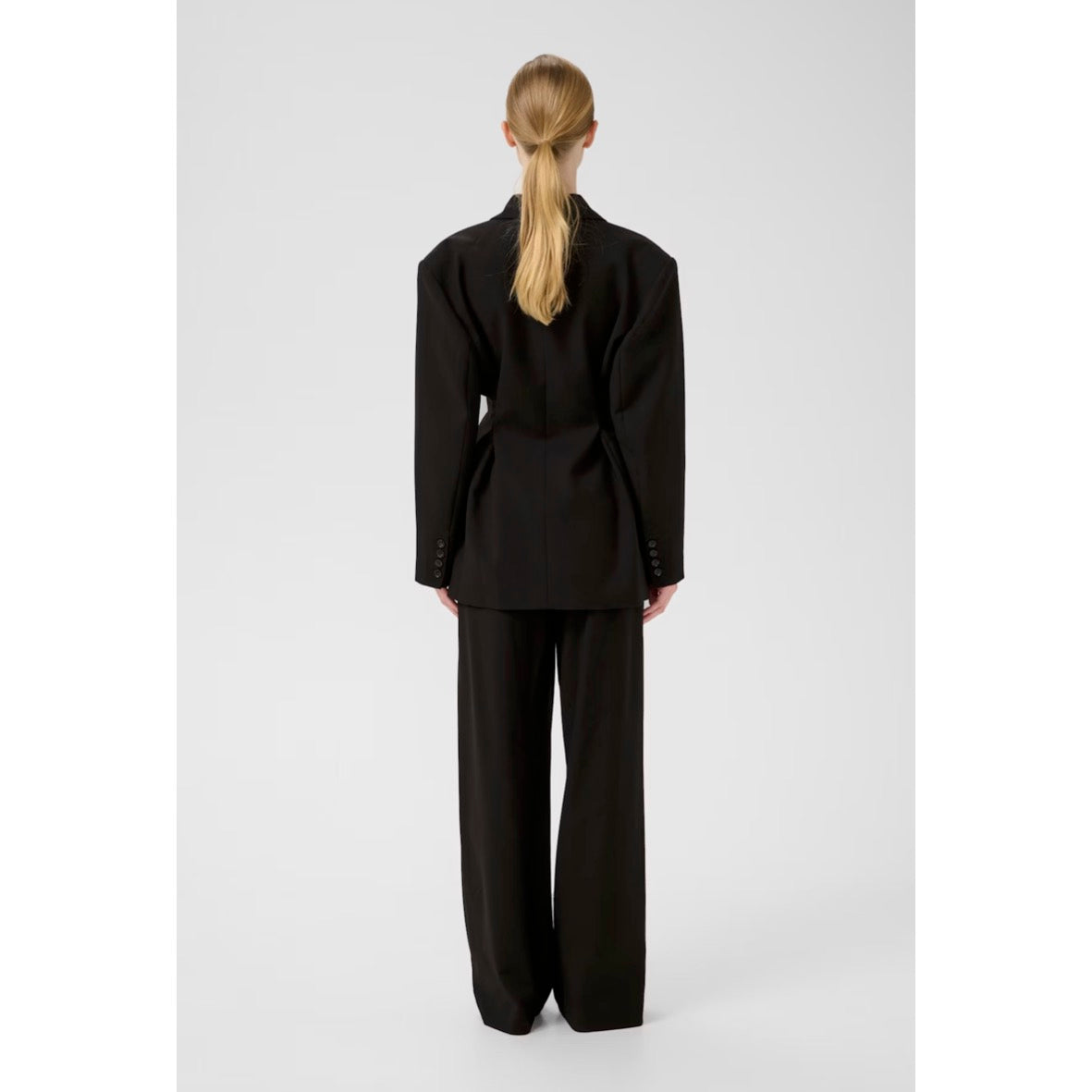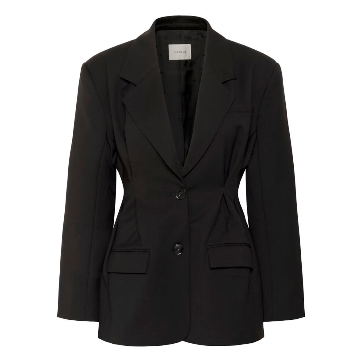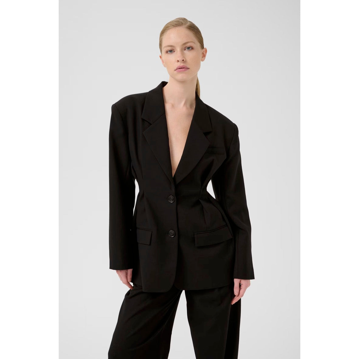 Tailored, oversized blazer with classic lapels and two-button closure. The design is defined by waist darts that create a shaped silhouette.