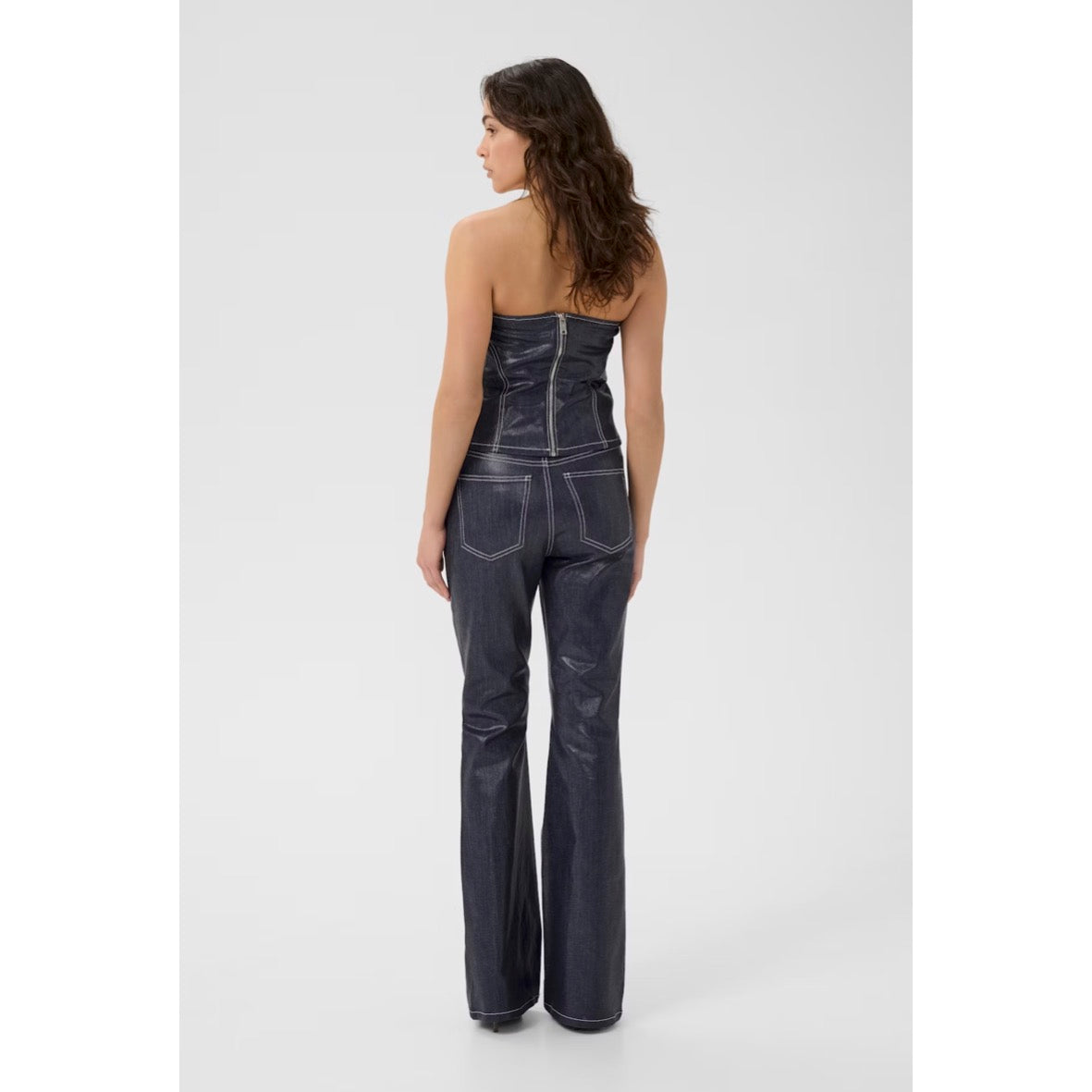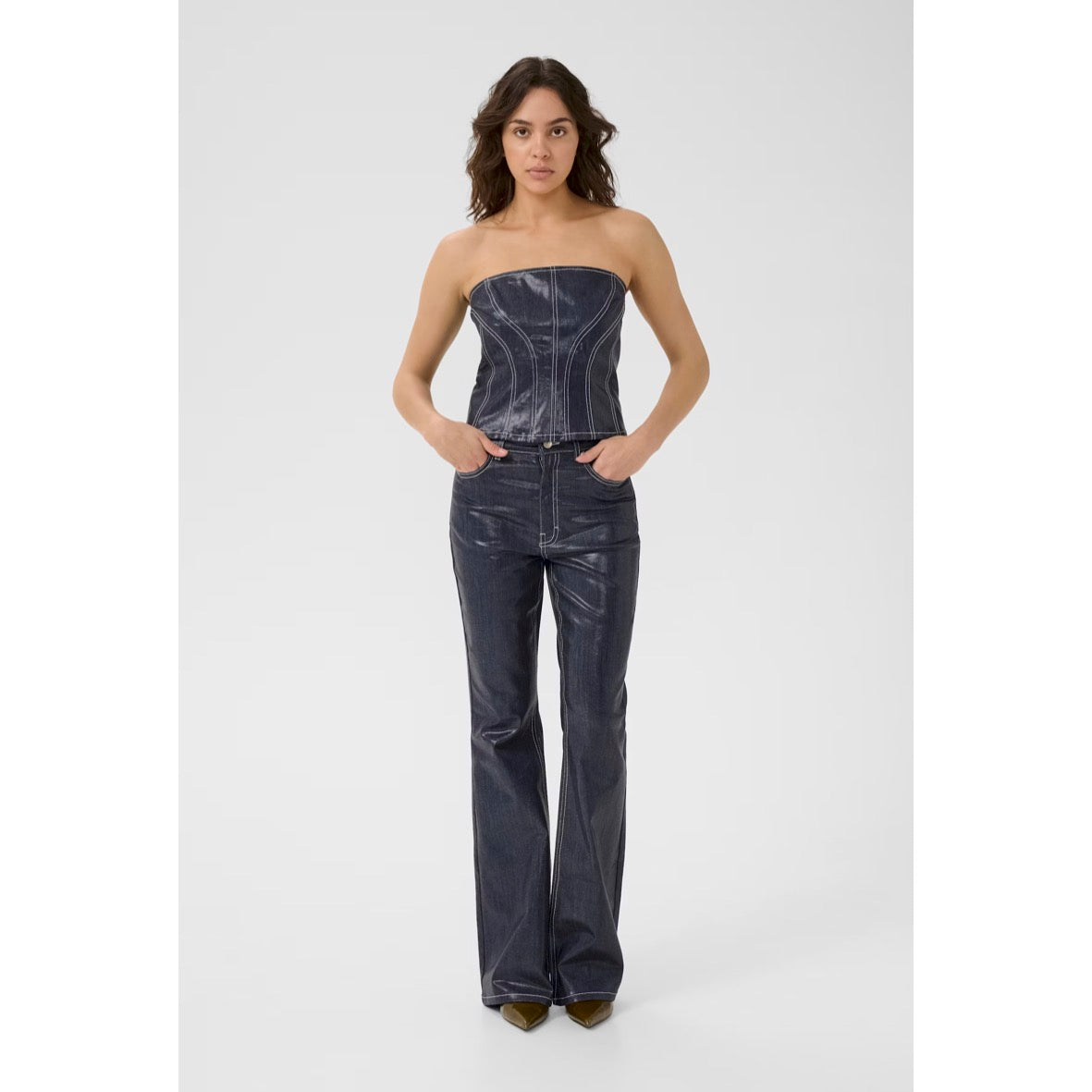 Coated denim corsage top with a strapless neckline, contrast stitching, and shaping seams. Designed with a back zip closure and structured fit for a sleek, polished silhouette.