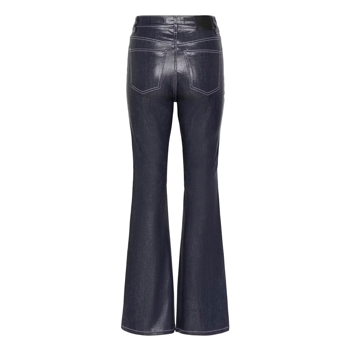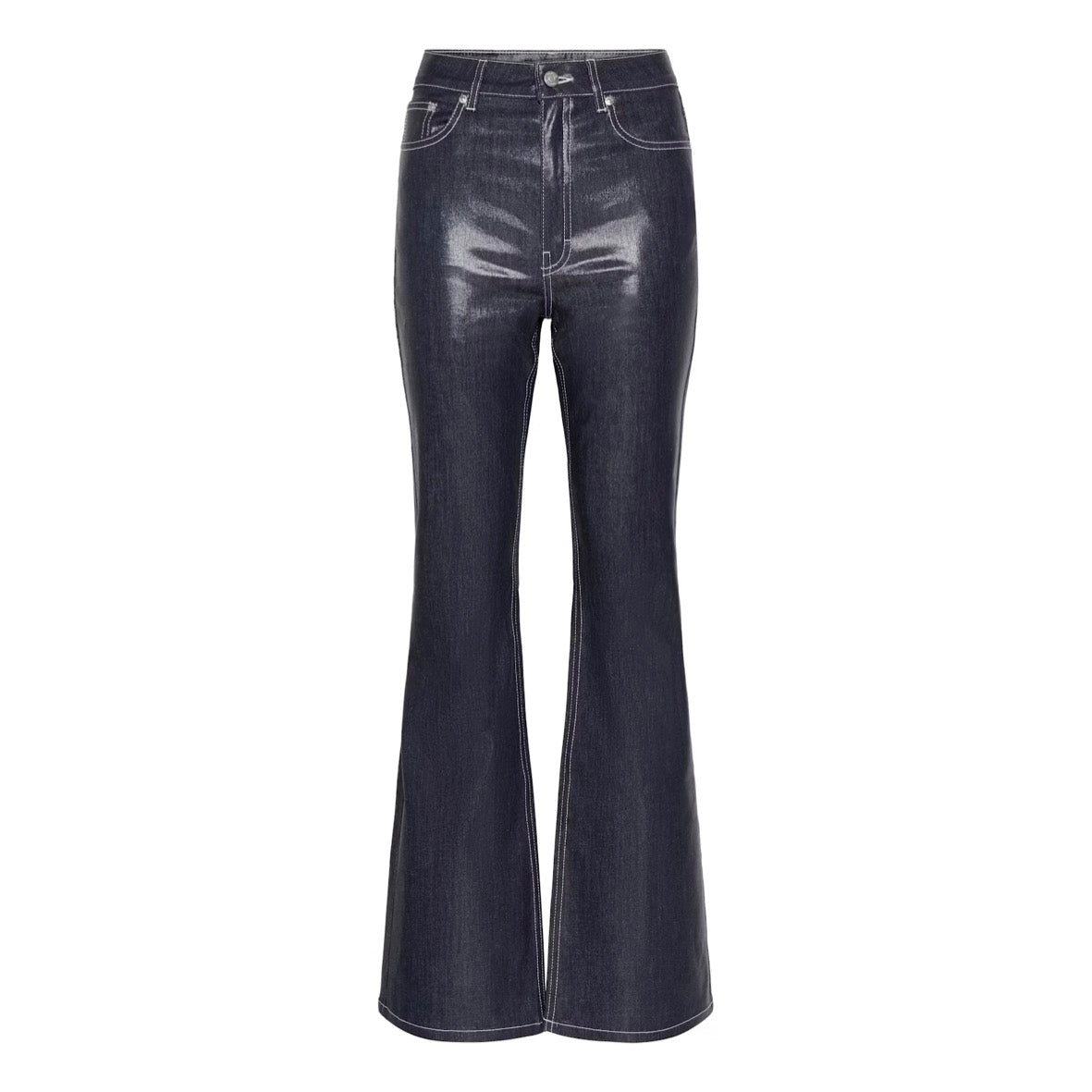 Coated denim trousers with high waist, fitted thighs, and flared legs. Designed with contrast topstitching and a subtle shine, offering a structured silhouette with a clean finish.