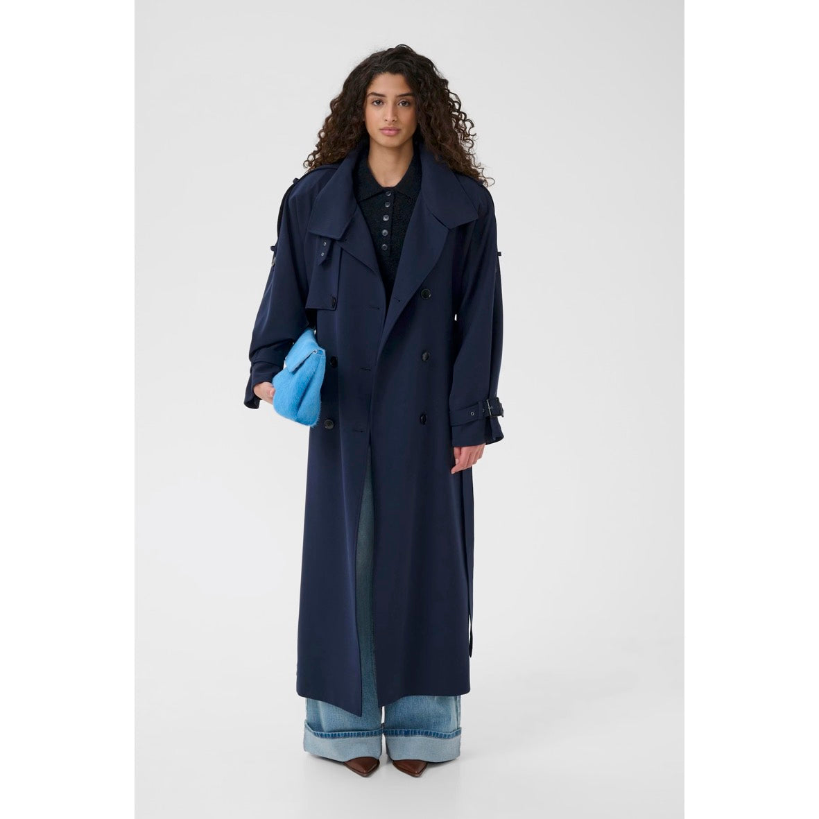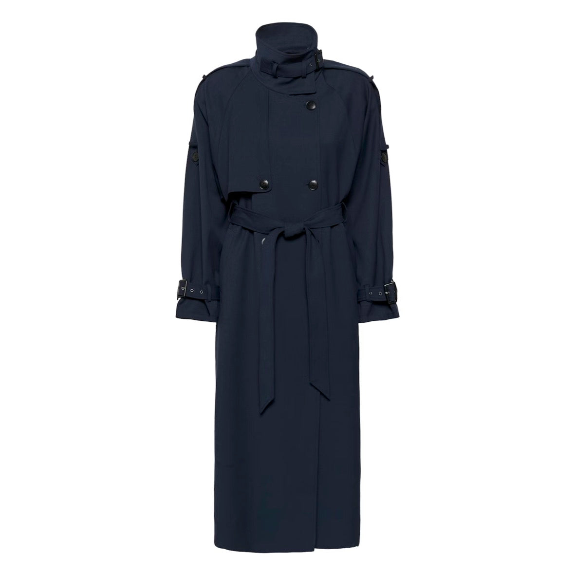 This trench coat features a relaxed fit, classic double-breasted front, adjustable belted waist, and high collar neckline. Timeless design details add versatility for various occasions while ensuring comfortable wear.