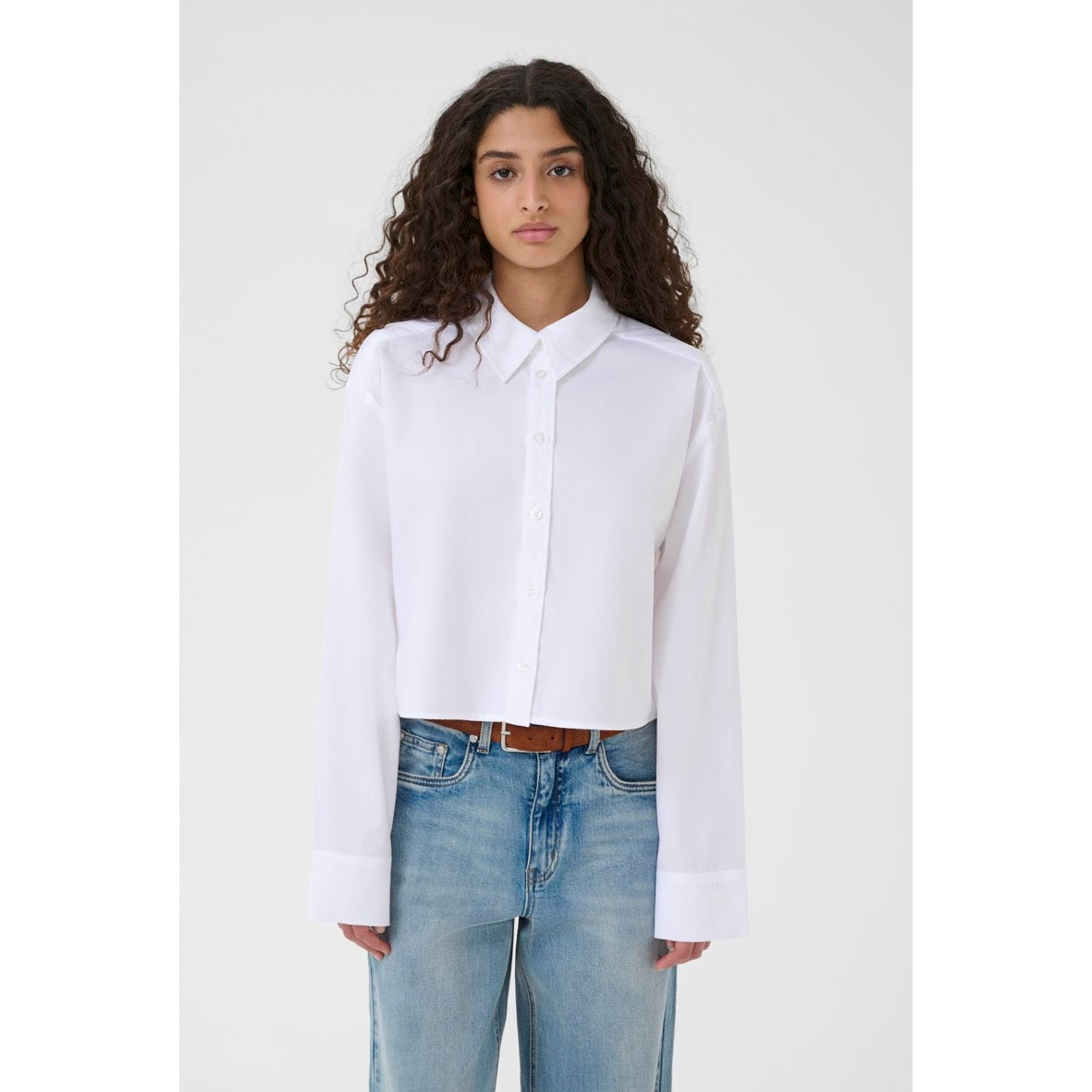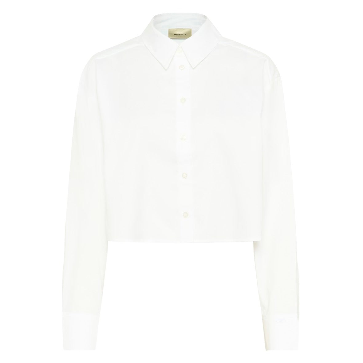Cropped shirt with classic button-down front, structured collar and long sleeves. Features a straight silhouette and visible button closure for a modern edge.