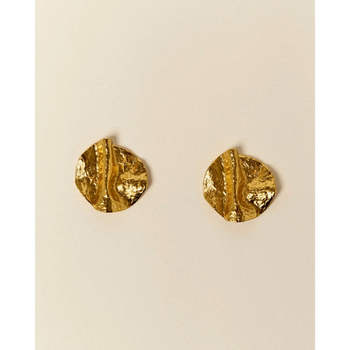 Gold-finish disc earrings with a textured effect and a star relief design.