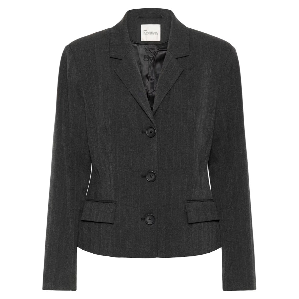 Blazer jacket with structured fit, notched lapel, three-button front, long sleeves, flap pockets, and subtle pinstripe effect for modern tailoring.