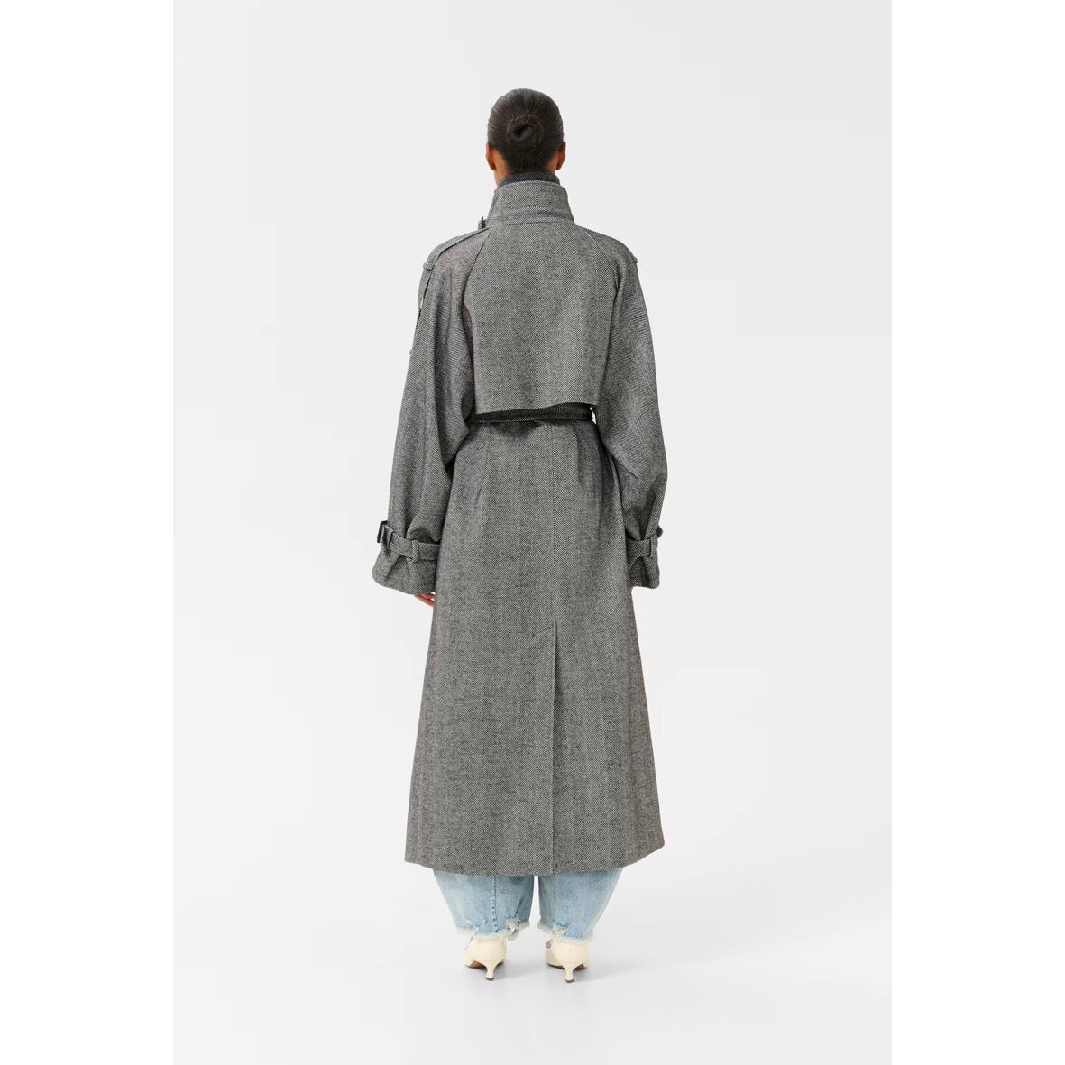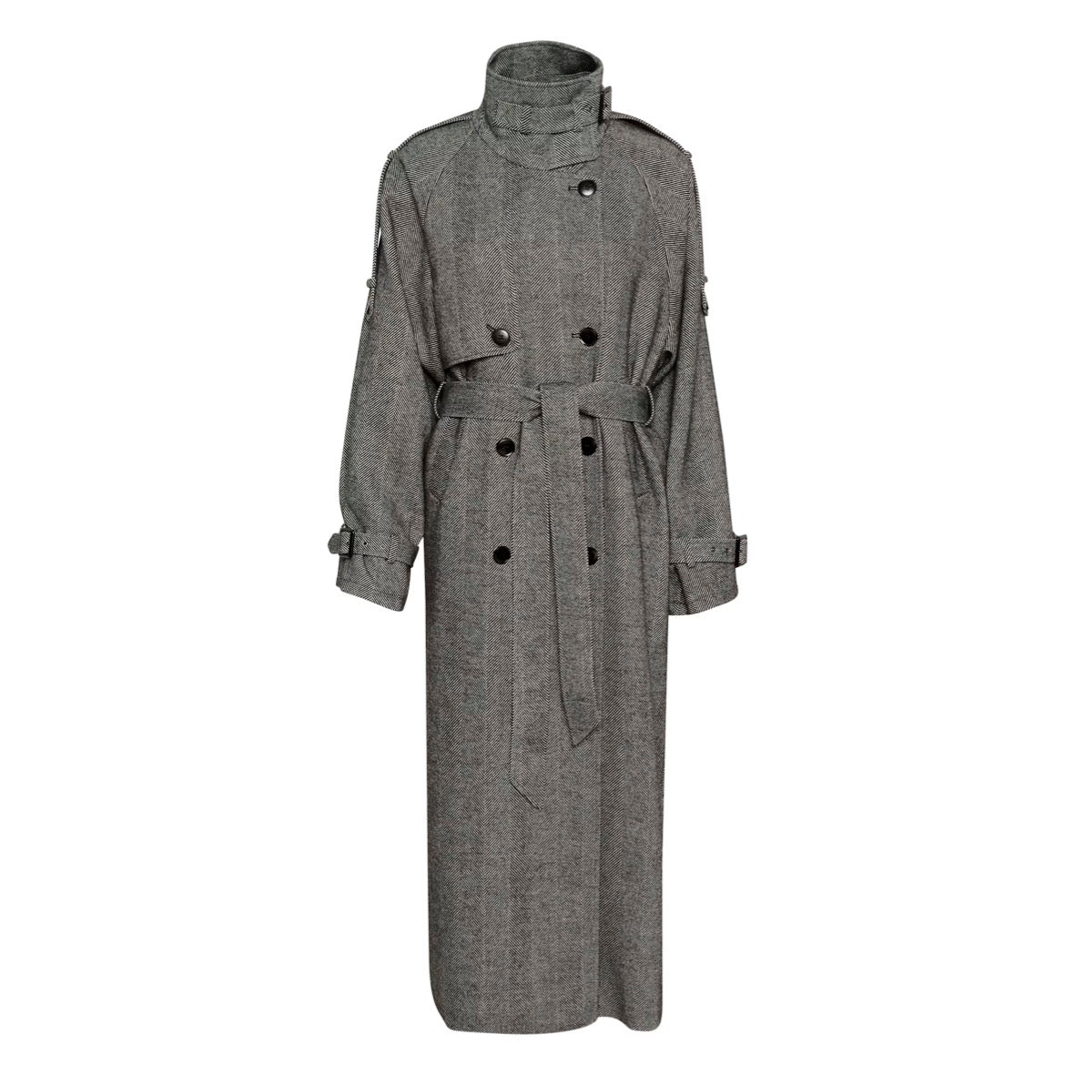 Long double-breasted coat with a high buckle collar, belted waist and cuffs, and button tab sleeves. Designed in a subtle herringbone weave with an oversized silhouette for a timeless and structured outerwear look.