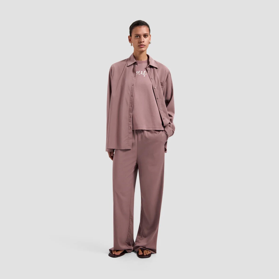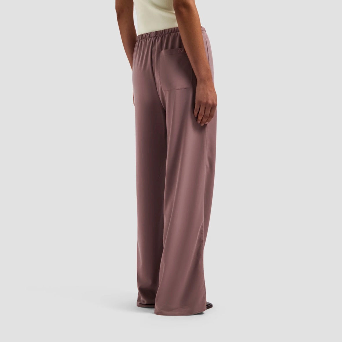 The Textured Drapey Pant in Twilight Mauve combines a straight fit with a fluid texture that moves effortlessly. An elasticated, adjustable waistband ensures comfort for all sizes, while the embroidered retro logo adds a subtle finishing touch.