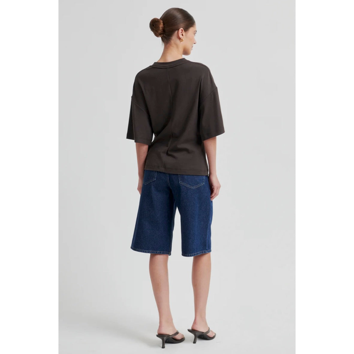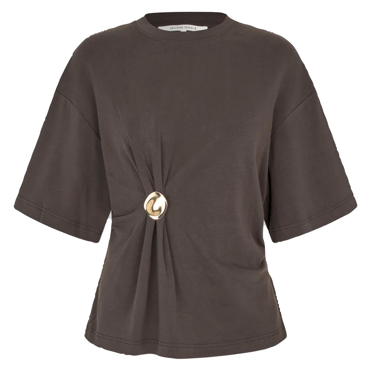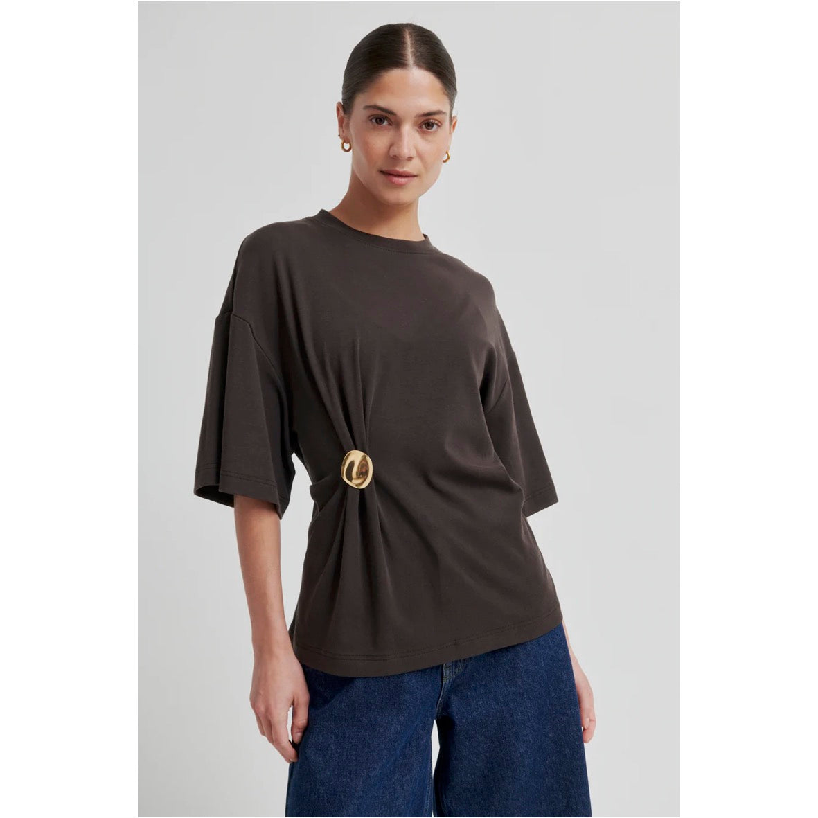Second Female T-shirt with brooch. The t-shirt is made in a soft and stretchy lyocell-cotton blend. Featuring a round neck and gathered detail at one side with detachable gold brooch. Dropped shoulders and short sleeves. Regular fit.