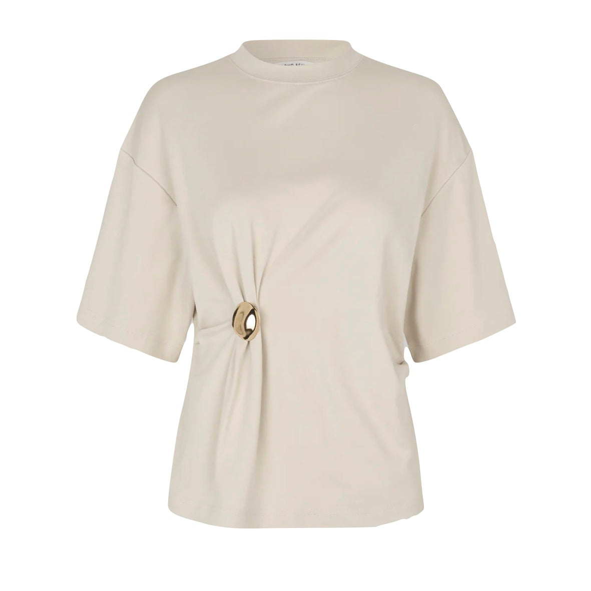 Second Female T-shirt with brooch. The t-shirt is made in a soft and stretchy lyocell-cotton blend. Featuring a round neck and gathered detail at one side with detachable gold brooch. Dropped shoulders and short sleeves. Regular fit.