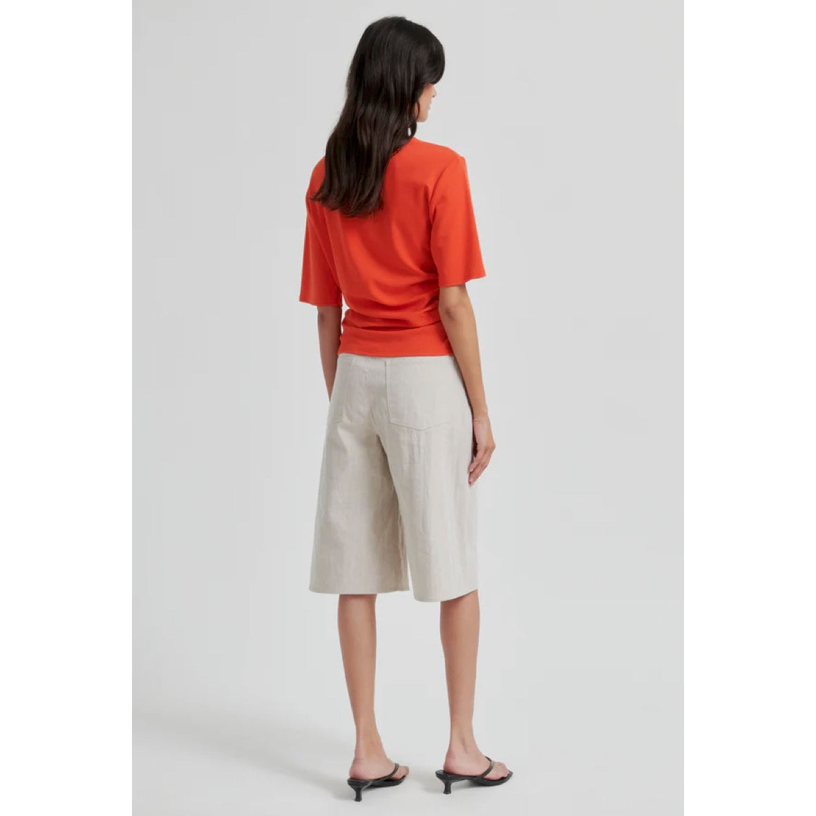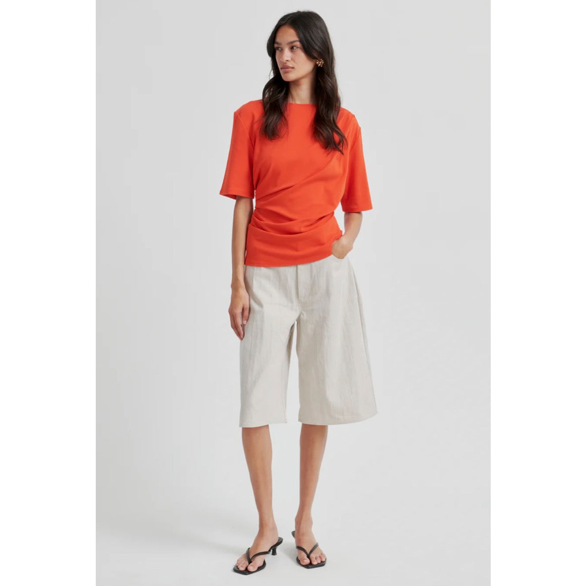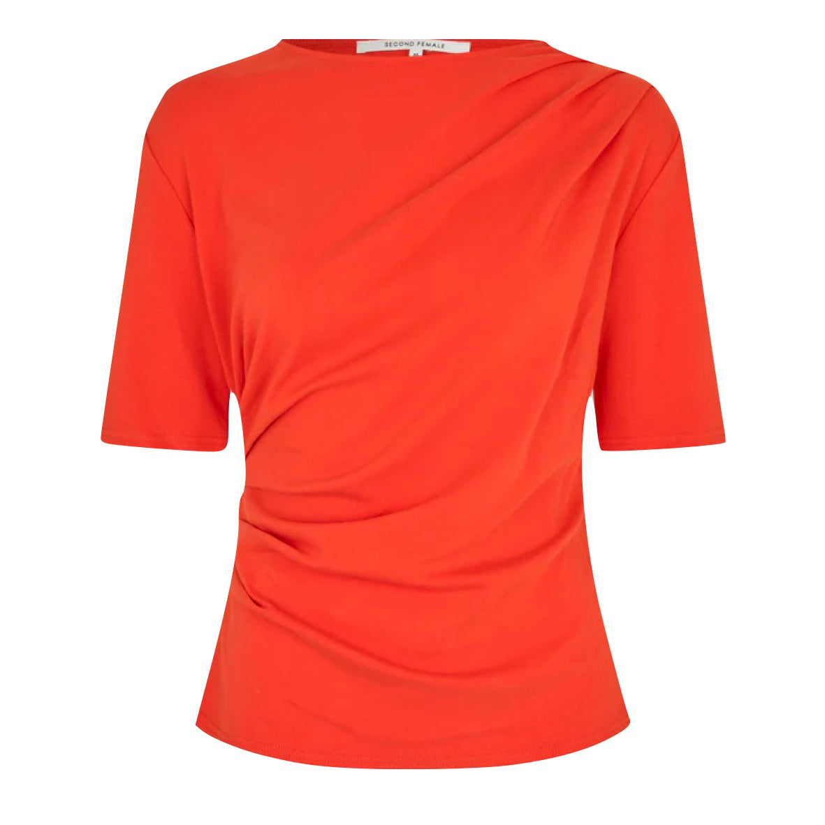 Second Female T-shirt with draping. The tee is made in a soft lyocell-cotton blend. Featuring draped details at shoulder and one side. Round neck and short sleeves. Regular fit.