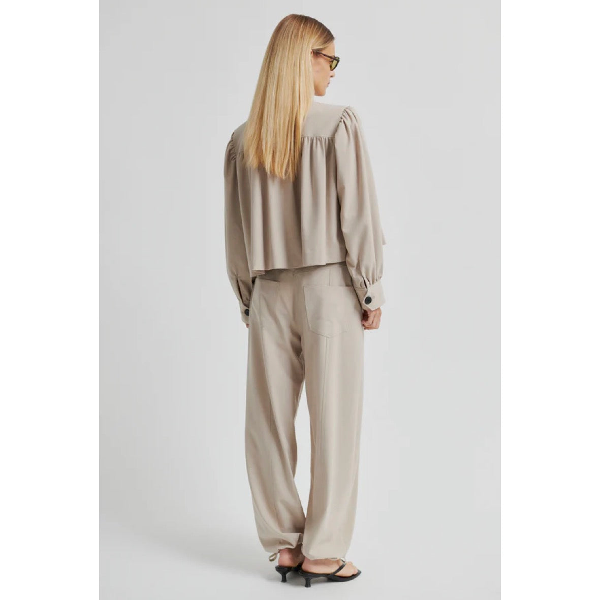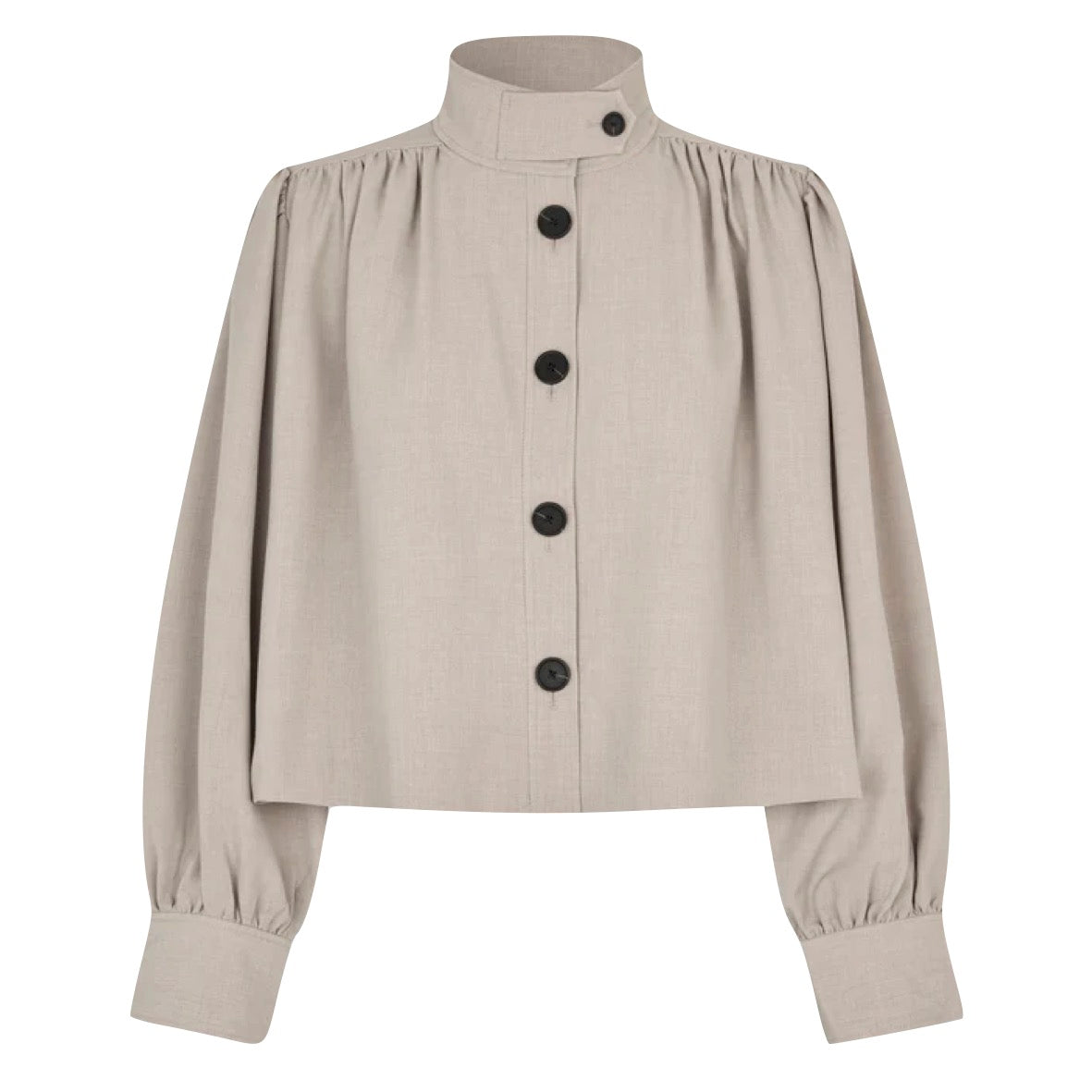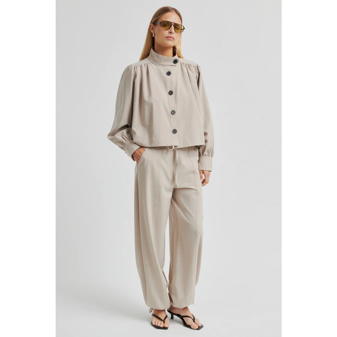 Second Female jacket with puffed sleeves. The jacket is made in a smooth fabric blend with drapy quality. Featuring a high neck with button fastening and gathered yoke. Puffed sleeves with buttoned cuffs. Fully lined. Wide, straight fit.