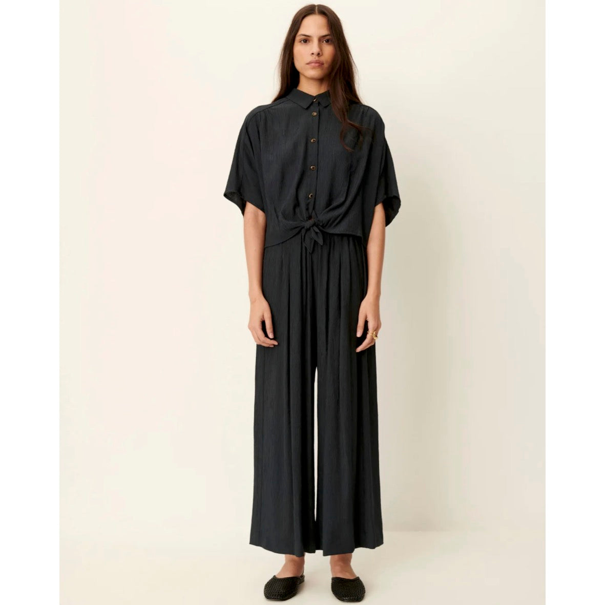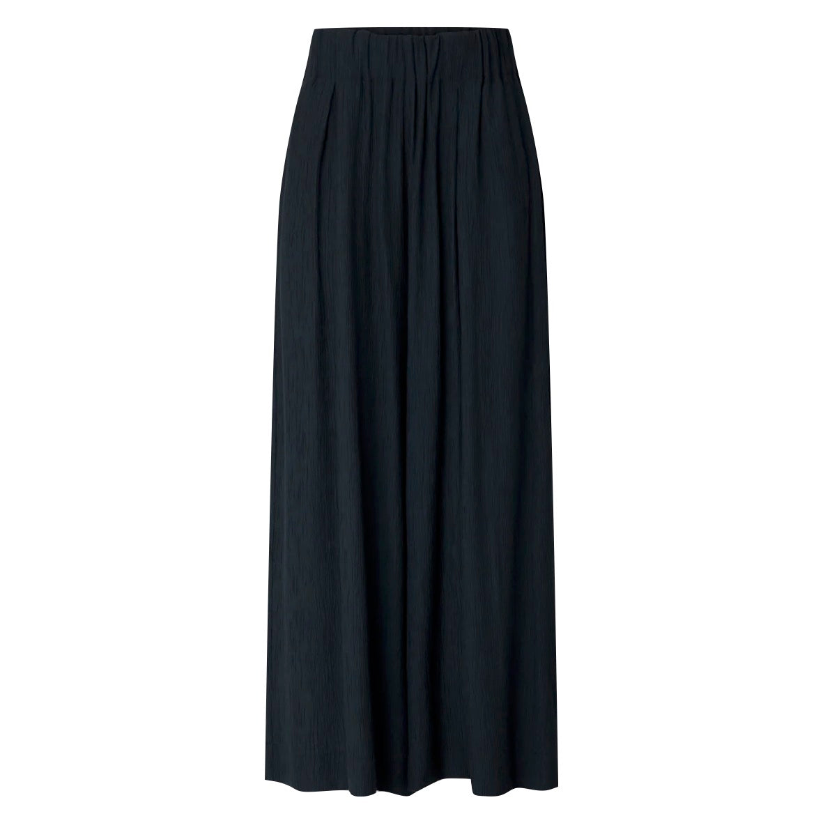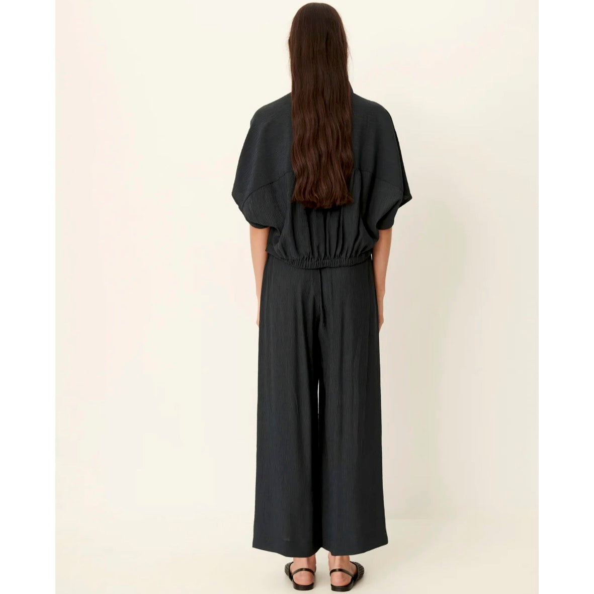 Loose-fitting 7/8-length trousers with elasticated waistband in soft viscose seersucker crepe.
