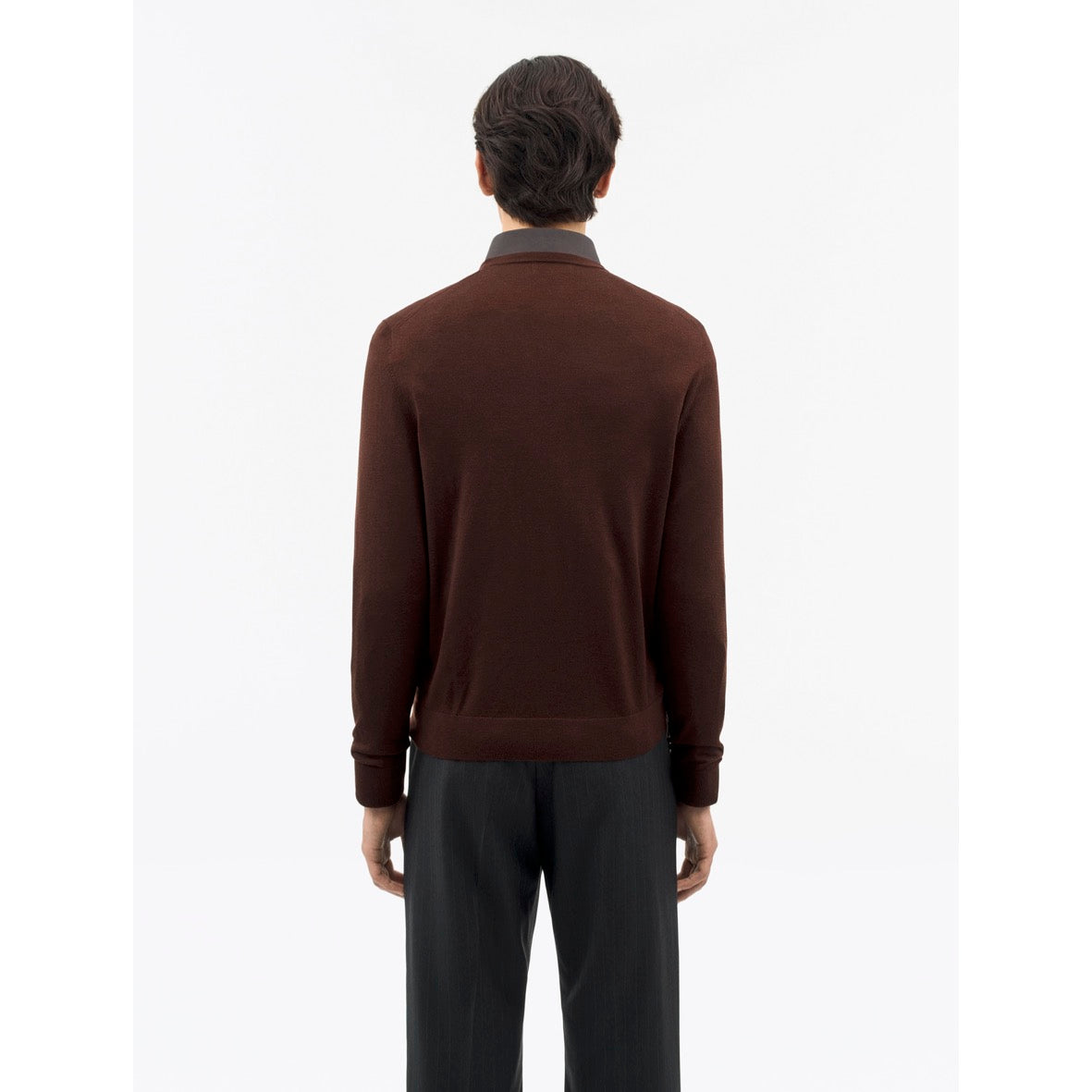 The slim-fit crew-neck is made from 100% Merino wool and features a fine knit with a jersey stitch. It is short-sleeved and has a French shoulder with visible fashioning. The self-double neck trim, along with the rib trimming at the bottom hem and sleeves, adds to its design. The crew neck is hip length. The wool in this product is certified by the Responsible Wool Standard.