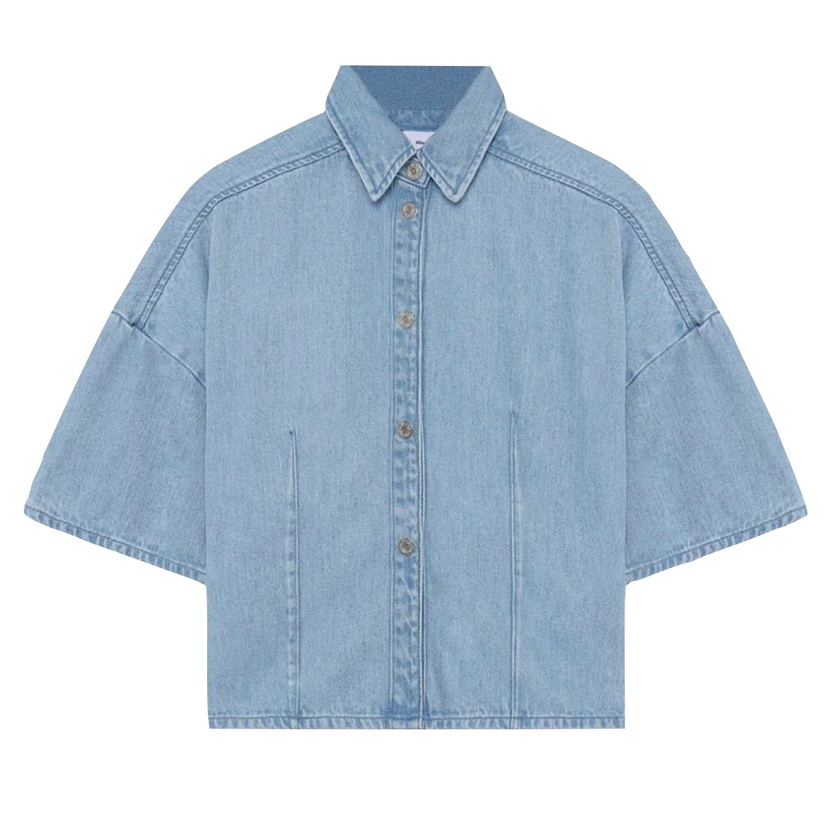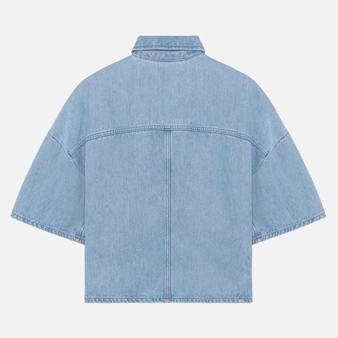The Gali Denim Shirt is designed with a fitted shape that accentuates the waist, creating a refined and elegant silhouette. The style features wide shoulders and short sleeves, and is crafted from a light, drapy denim, finished with Won Hundred metal snap buttons at the front.